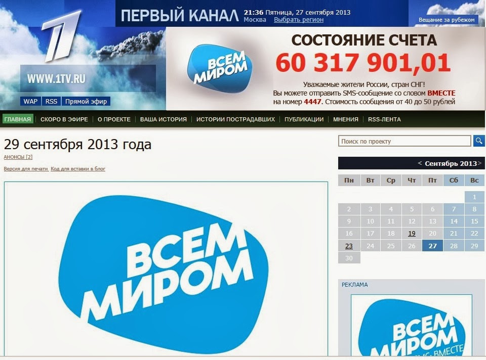 Одновременно 1 Канал проводит 29 сентября 2013 года благотворительный марафон "Всем миром", в котором может принять участие любой желающий. Инструмент помощи марафона - передача СМС-сообщений.
